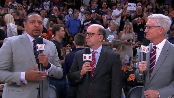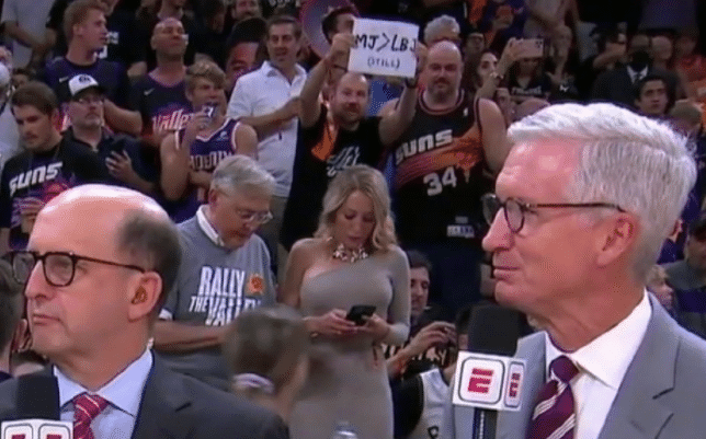 这场比赛开始前的直播,太阳的球迷们都很疯狂,其中就有一名太阳的球迷,他高举“MJ>LBJ”标语,表达着自己的态度。很显然这个标语的的意思就是篮球之神迈克尔-乔丹要比勒布朗-詹姆斯强,詹姆斯现在处于休赛期,通过这样的方式,实力躺枪。