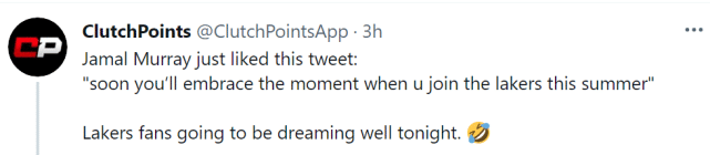 穆雷很快取消了自己的点赞,但球迷的截屏已经引起热议。湖人一些媒体账号已经迫不及待地为穆雷PS上了湖人27号球衣,美媒clutchpoints调侃道:“湖人球迷今晚能做个好梦了。”