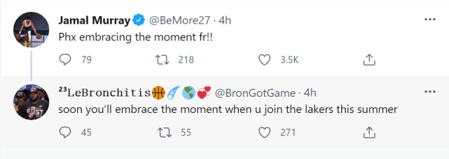 来源:24直播网07-08 11:0924直播网讯昨日,总决赛G1,太阳主场118-105击败雄鹿。正在养伤的掘金后卫贾马尔-穆雷更新社媒写道:“菲尼克斯拥抱这一时刻!”一个球迷在评论区留言道:“很快你也将拥抱这样的时刻,当你今年夏天加盟湖人后。”没想到的是,穆雷本人竟然点赞了这一言论,并被球迷截屏。
