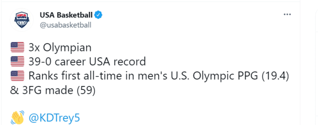 就在今天,美国男篮官方社媒也晒出了杜兰特训练首日的照片和视频,并配文写道:“第三次参加奥运会,美国国家队生涯39胜0负,场均19.4分,累计命中59记三分球,都排在美国男篮队史第一,@凯文-杜兰特。”