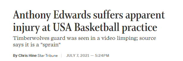 可是美国男篮训练营的第二天,爱德华兹就意外受伤。据森林狼当地媒体报道,爱德华兹的伤情还不明朗,但消息人士透露很可能是脚踝的扭伤,不是膝盖的扭伤。森林狼有两位年轻球员入选陪练队,除了爱德华兹,还有中锋里德。