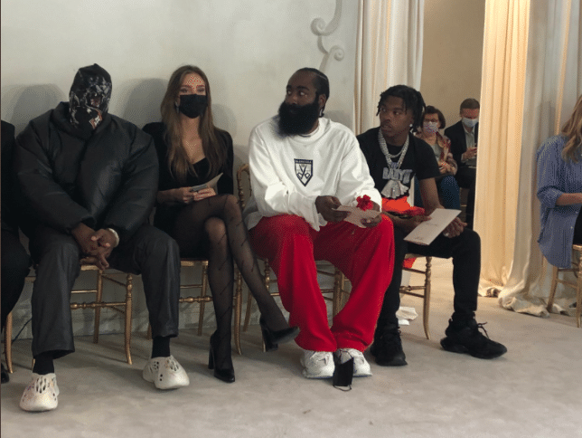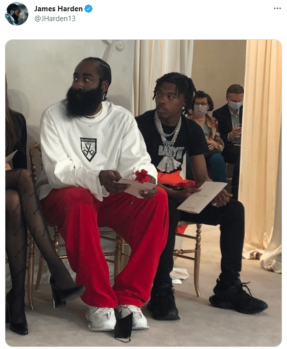 不久前,哈登更新社交媒体,发推晒出自己的近照——哈登和坎爷(Kanye-west)、Lil Baby出席巴黎世家2021秋季高级时装周秀场;此时哈登身穿红色长裤搭配白色长袖,手里拿着一朵鲜花,哈登还在Ins上晒出自己参加活动的照片。