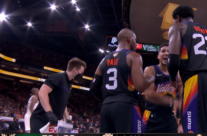 而布克的投篮命中率不是特别高,但是在首节保罗0分的情况下是他扛起了球队,单节拿到12分率领球队领先,几次中距离非常出色,还有各种高难度的得分表现!比较有趣的是,暂停时,转播镜头给到了场边的布克,布克也喝起了“神秘饮料”。