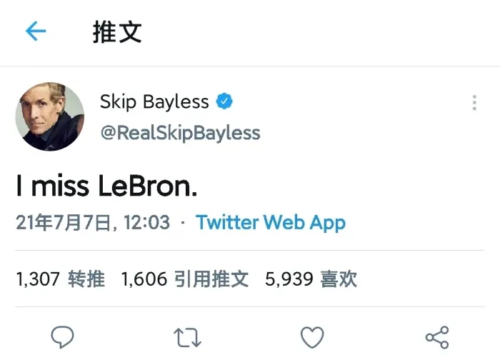 名嘴Skip就发推感慨“我想念詹姆斯了”不过他情况特殊,他的工作多是伴随老詹的,抓住一个黑点使劲喷,甚至掘金与太阳的系列赛,他都能发布一些跟老詹有关的话题。