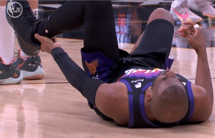 不过此时,大洛佩兹没有收住自己的右脚,还是往前跨了一步。这球保罗出手三分直接命中,但落地时由于大洛已经侵犯保罗圆柱体,导致保罗落地时扭了一下,随后倒在地上,没有迅速起身。好在这次被垫脚,保罗的问题不是太大。