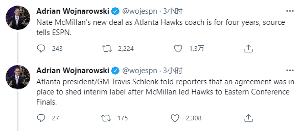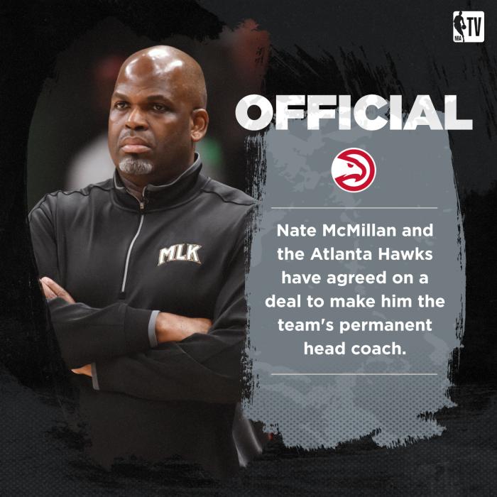 56岁麦克米兰以临时主帅的身份带队杀进东决,展现出自己的执教能力,最终和老鹰签下4年执教合同;老鹰总经理施伦克已经宣布这一喜讯,并且直言:从他接任临时主教练的第一天起,我们决定都赛季结束后与他续约。