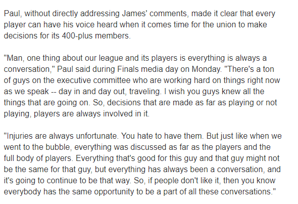 保罗明确表示一切都是一场对话,这是联盟400多名球员的共同决定,每个人都有同样的机会参与其中。