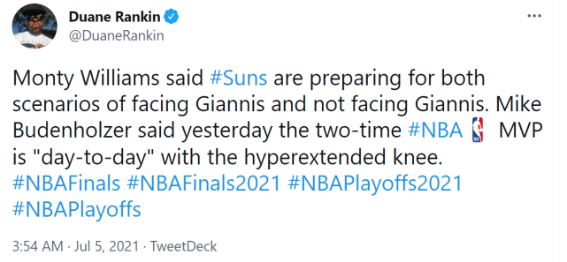 来源:24直播网07-05 11:2724直播网讯 雄鹿和太阳将在7月7日打响总决赛首战,而太阳主帅蒙蒂-威廉姆斯告诉记者,球队正在准备两套方案:一套是对阵拥有字母哥的雄鹿,而另一套是对阵没有字母哥的雄鹿。就在一天前,雄鹿主帅布登霍尔泽表示,字母哥目前的膝盖状态是每日观察,而外界普遍认为,字母哥有希望在第一场总决赛就回归。字母哥打不打还没最终敲定,蒙蒂计划做好两手准备。