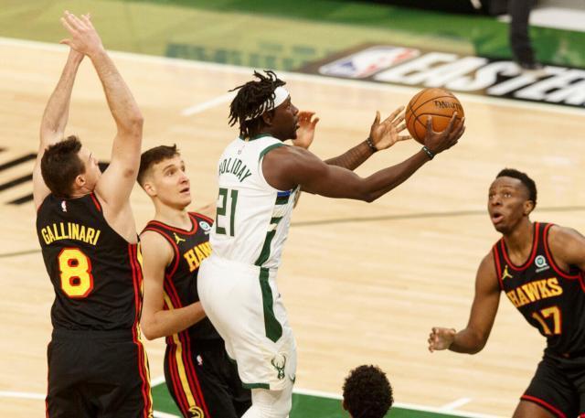 7月4日,东部决赛G6,距离总决赛,雄鹿队只剩下一场比赛,米格尔顿的32分和霍乐迪的27分让人们忘记了字母哥的事情,他们击败了老鹰队,进入了总决赛。