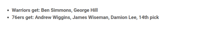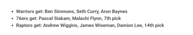 勇士送出维金斯、怀斯曼、达米安-李和14号签,得到西蒙斯和乔治-希尔。如果勇士想留下7号签,他们可以尝试新的选择。维金斯仍是不变的筹码,把帕斯卡尔换成怀斯曼和李。怀斯曼是一个有潜力的中锋,但勇士没有时间等待他的成长了。