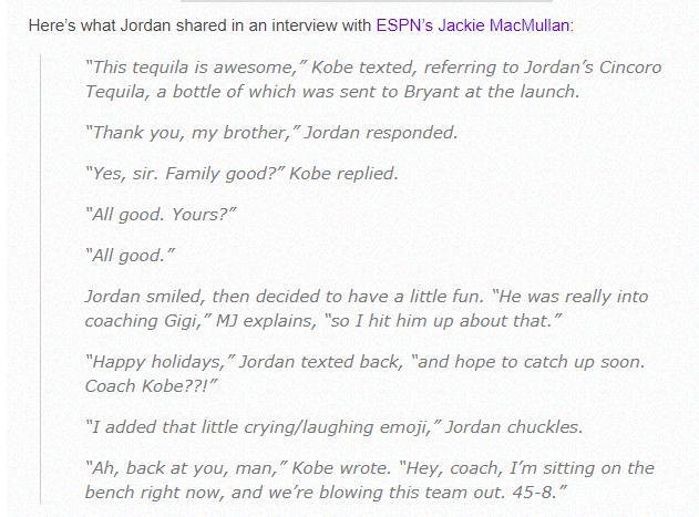 在聊天中,科比感谢了乔丹赠送的龙舌兰酒,并向乔丹的家人问安。乔老爷子也是也同样问安了科比的家人,并且调侃退役后的科比成为GIGI球队的教练。不过科比也是很满意成为教练的角色,科比表示:嘿,教练,我现在坐在板凳上,我们45-8打爆这支球队。