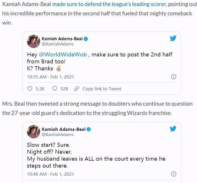 不得不说比尔的妻子真的是太霸气了,说她是NBA球员中最硬气的爱人并不为过,虽然比尔的成就不是NBA现役球员中最高的,但作为球员的爱人,不允许其他的球员这样来贬低自己的爱人。