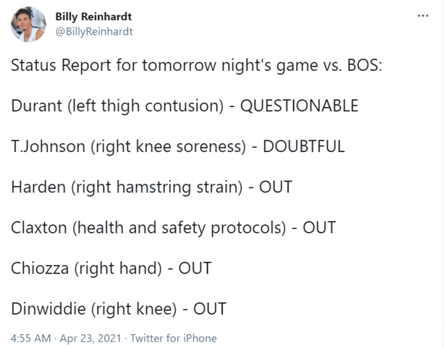 首发:哈登、欧文、杜兰特、格林和小乔丹