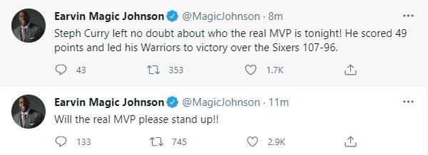 勇士客场战胜76人!魔术师发推盛赞:库里毫无疑问就是今晚的MVP!