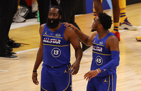 第三节的比赛开始后,詹姆斯队这边更变了首发阵容,利拉德顶替詹姆斯首发出场,随后库兹马更新社交媒体:把冰袋绑上吧,老铁,这一节的比赛詹姆斯并没有上场,因为湖人这边浓眉受伤,詹姆斯也是单核带队,比较累,所以下半场的比赛詹姆斯休息,詹姆斯并未首发出战,转播镜头给到了在替补席上的詹姆斯,在在板凳席上啃起了零食。这一节的比赛字母哥延续着自己出色的发挥,他前16投全部命中轰下了35分,这一节的比赛末段,两队再互飚三分球,米切尔压哨三分命中,詹姆斯队第三节46:45净胜杜兰特1分。