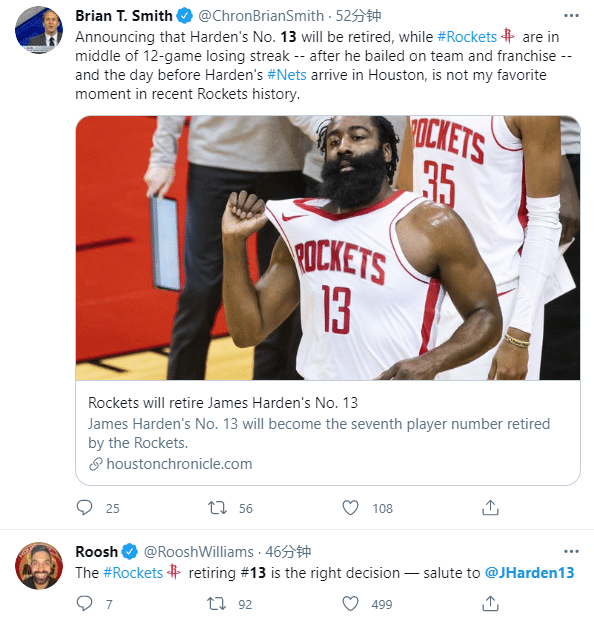 体育评论员Roosh Williams发推写道,火箭退役哈登13号是正确的决定,向哈登致敬;不过名记Brain T Smith有些不开心,他在社交媒体上写道:火箭惨遭12连败却宣布退役哈登13号球衣,哈登即将身披篮网战袍重返休斯敦,这不是我最喜欢的火箭时刻。