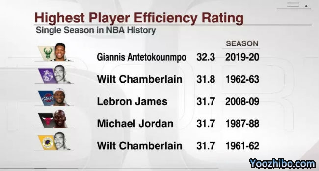 根据NBA数据专家Dean的统计,字母哥本赛季的PER值高达31.91,超越张伯伦62-63赛季31.82的纪录独享历史第一。