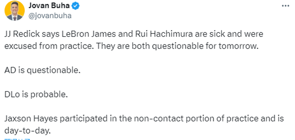 湖人对阵国王的伤情更新,据雷迪克透露,詹姆斯和八村垒都因生病缺席了今天的训练,明天的状态都是出战成疑,浓眉(脚踝扭伤)来到球馆接受治疗也出战成疑,拉塞尔(拇指扭伤)大概率复出,海斯进行非接触式训练,进入每日观察名单。