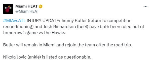明天热火将客场挑战老鹰,热火官宣,(回归比赛的状态调整)、理查德森(脚跟伤势)将缺席明天的比赛;巴特勒将留在迈阿密,将在球队客场之旅后归队;约维奇(脚踝伤势)明天对阵老鹰出战成疑。