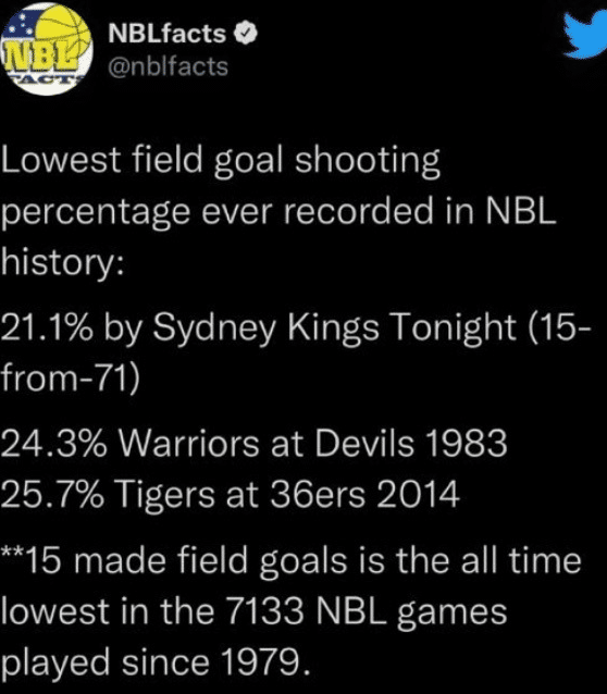 这场比赛国王队的全场投篮命中率为21.1%,全场71投只有15中!全场只投中15球, 这也创造了NBL联盟自从1979年创立以来,41年迄今全部7133场比赛中最低的纪录,此前从未有过单场只命中15球的情况。