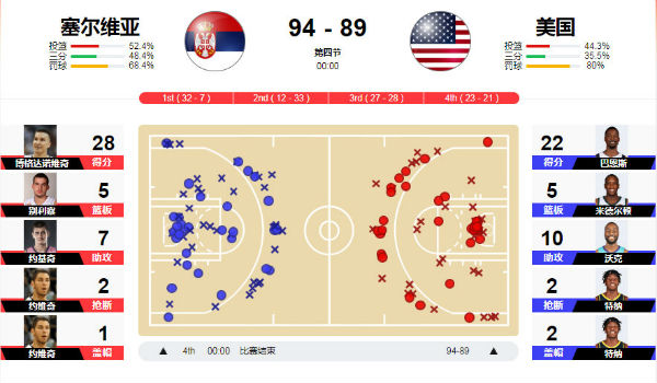 塞尔维亚:博格达诺维奇28分4篮板6助攻,约基奇9分3篮板7助攻,卢西奇15分4篮板,米卢蒂诺夫7分2篮板2助攻,约维奇9分3篮板4助攻,博班8分3篮板。