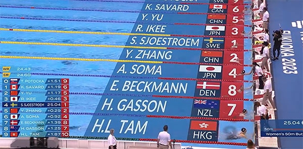 张雨霏出发反应用时为0.67秒,50米蝶泳直接冲刺,考验的是反应、速度和爆发力,最终张雨霏第一个到边,成绩是,恭喜张雨霏晋级到半决赛。