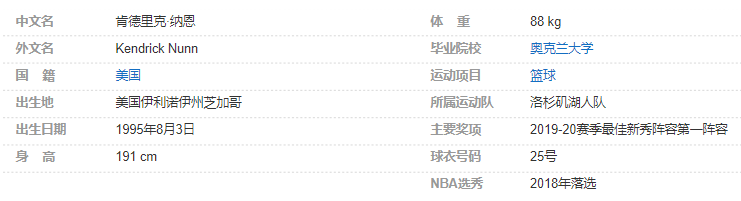 肯德里克·纳恩(Kendrick Nunn),1995年8月3日出生于美国伊利诺伊州芝加哥(Chicago, Illinois),美国职业篮球运动员,司职得分后卫,效力于NBA洛杉矶湖人队。
