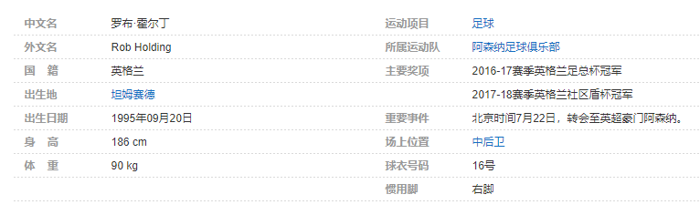 罗布·霍尔丁(Rob Holding),1995年9月20日出生于英国坦姆赛德,英格兰足球运动员,场上司职中后卫,现役英格兰U21国脚,出道于博尔顿青训系统,现效力于英格兰足球超级联赛的阿森纳足球俱乐部。个人简介
