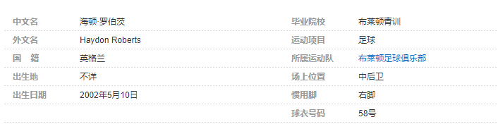 海顿·罗伯茨现效力于英超的布莱顿足球俱乐部。
