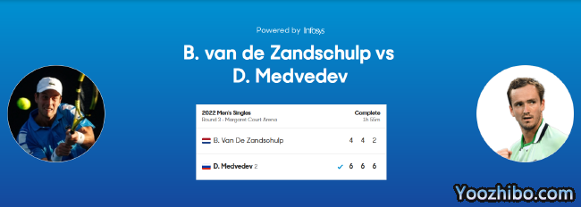 第三盘比赛中,梅德韦杰夫首局浪费两个破发点机会,比分落后的德赞德西洛普始终无法找到回破机会,第五局中又连续获得破发点机会,梅德韦杰夫随后一个长多拍得分完成破发,顺势保发下比分来到4-2领先。盘末阶段大比分落后的德赞德西洛普斗志逐渐下滑,梅德韦杰夫连破带保下6-2赢得第三盘胜利。最终,赛会2号种子梅德韦杰夫继续前进,3-0完胜美网八强德赞德西洛普,挺进澳网男单16强。