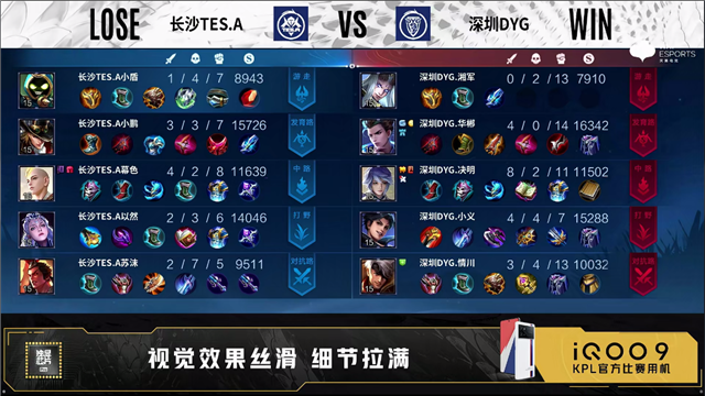 第四局开局长沙TES.A中路、发育路换线。1分51秒深圳DYG对抗路击杀廉颇拿下一血。2分42秒深圳DYG中路击杀蒙犽。3分57秒长沙TES.A对抗路击杀鬼谷子。5分50秒长沙TES.A拿下暗影暴君。6分46秒长沙TES.A摧毁敌方发育路外塔。7分20秒长沙TES.A摧毁敌方对抗路外塔。7分47秒长沙TES.A拿下主宰。8分31秒长沙TES.A摧毁敌方发育路二塔。8分43秒深圳DYG摧毁敌方对抗路外塔。9分10秒深圳DYG野区击杀嬴政。9分30秒深圳DYG摧毁敌方中路外塔。9分53秒深圳DYG摧毁敌方发育路外塔。10分35秒长沙TES.A拿下暗影主宰。10分41秒深圳DYG拿下暗影暴君。11分54秒长沙TES.A摧毁敌方对抗路二塔。12分10秒野区团深圳DYG打出0换3。13分51秒深圳DYG摧毁敌方中路二塔。14分50秒长沙TES.A拿下暗影主宰,深圳DYG拿下暗影暴君。16分20秒长沙TES.A中路击杀镜。16分53秒长沙TES.A摧毁敌方发育路高地塔。18分10秒野区团双方1换1。18分56秒深圳DYG拿下暗影主宰。22分03秒长沙TES.A拿下风暴龙王。23分08秒对抗路团深圳DYG打出1换5团灭对手。23分58秒深圳DYG摧毁水晶拿下比赛。