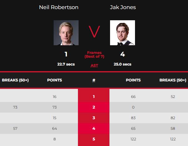 世界第4罗伯逊面对杰克琼斯,首局罗伯逊16-66落败。第二局,罗伯逊打出单杆73分零封对手。第三局,琼斯回敬罗伯逊单杆82分。第四局,两人展开鏖战,罗伯逊单杆57分未能超分。结果琼斯最终65-64绝杀。第五局,琼斯单杆129分终结比赛,4-1取得胜利。