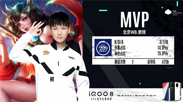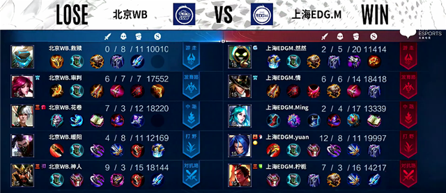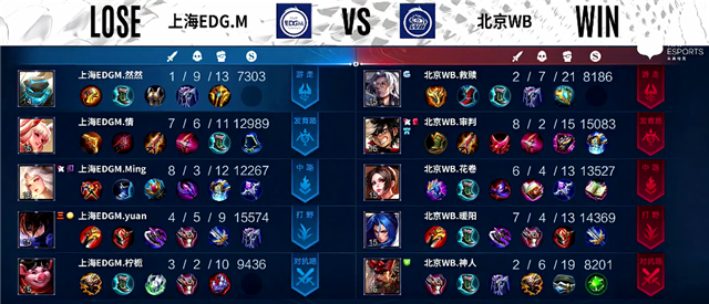 双方和平开局。2分钟北京WB下路越塔强攻,公孙离拿下一血。2分47秒云缨拿下暴君。4分39秒上海EDG.M上路一塔被破。5分钟北京WB入侵野区,廉颇被击杀。5分20秒公孙离推掉下路一塔。6分36秒上海EDG.M中路一塔被破。7分11秒中路团战,北京WB打出0换2并推掉中路二塔。7分51秒周瑜推掉下路高地塔。8分10秒上海EDG.M上路二塔被破。9分40秒北京WB推掉上路高地塔,团战打出2换3。10分22秒北京WB推掉水晶拿下本场比赛胜利。