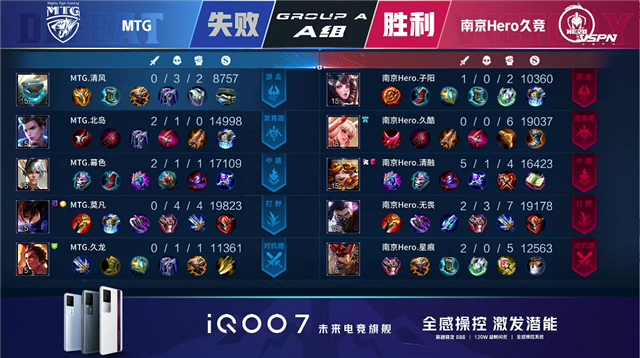 2分28秒,南京Hero不知火舞击杀马超拿下一血。3分10秒,MTG拿下暴君。5分15秒,南京Hero伽罗上路击杀马超,随后破掉MTG上一塔。5分38秒,南京Hero中路击杀牛魔。6分40秒,中路团,MTG打出1换2。8分12秒,中路团,MTG再次打出1换2,随后破掉南京Hero上二塔。8分58秒,MTG周瑜烧掉南京Hero中一塔。9分36秒,MTG破掉南京Hero下二塔。10分45秒,暴君团,MTG打出1换3。11分23秒,MTG拿下暗影暴君。12分15秒,MTG拿下暗影主宰。13分22秒,MTG破掉南京Hero中二塔。15分40秒,MTG拿下暗影暴君。16分42秒,中路团,南京Hero打出1换2。19分19秒,南京Hero拿下暗影主宰,随后团战南京Hero打出1换2。20分钟,双方团,南京Hero打出2换3。23分11秒,中路团,南京Hero打出1换5团灭对手。23分58秒,南京Hero上路平推摧毁MTG水晶3:0赢下比赛。