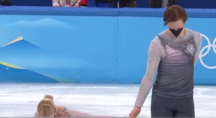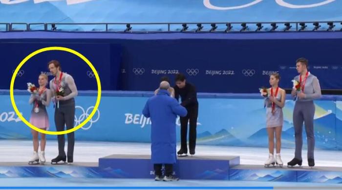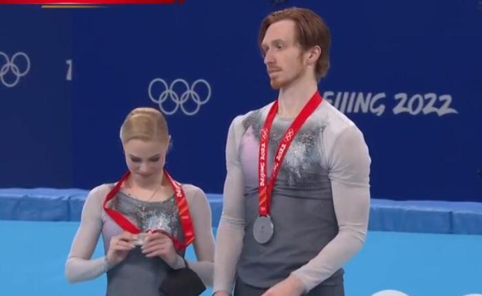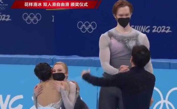 赛后的颁奖仪式上,俄奥队两对组合率先滑上冰面。此时,莫洛佐夫已经显得有些意兴阑珊。她的搭档塔拉索娃还在用花滑的特有动作,朝观众鞠躬致意。但莫洛佐夫却连弯腰都不愿意,全程敷衍了事,随后来到领奖台和另一对俄奥队组合拥抱。