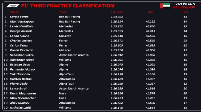 2022年F1阿布扎比大奖赛第3次练习赛成绩表: