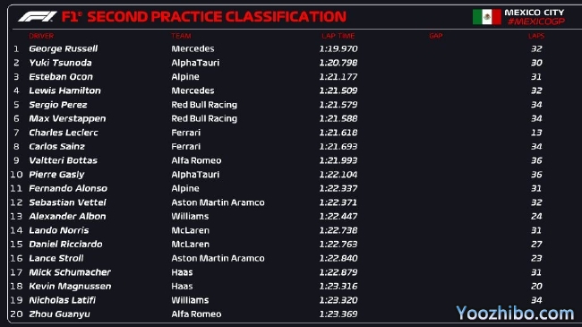 2022年F1墨西哥大奖赛第2次练习赛成绩表: