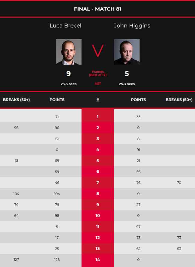 本场决赛采用17局9胜制,分为2个阶段进行。第一阶段比赛一开场,布雷切尔就表现出了很强的攻击性。首局,他凭借多次上手,以71-33先声夺人。第二局,他直接轰出单杆96分,以96(96)-0零封再胜一局。第三局,他又是通过多次上手,以61-8拿下,大比分3-0领先。希金斯在第四局终于找到手感,在多次上手后,以91-0扳回一局,双方进入中场休息。