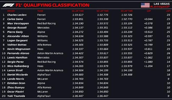 2023F1拉斯维加斯大奖赛排位赛成绩: