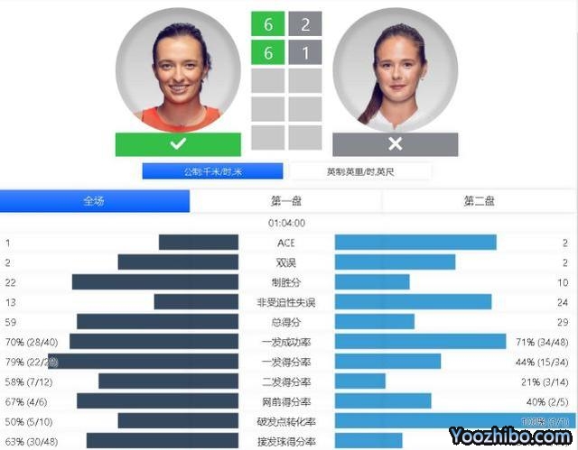 首盘第2局斯维亚泰克在第4个破发点兑现,取得2-0的领先。第3局卡萨金娜迅速回破,随后她保发追至2-2平。第6局斯维亚泰克再次完成破发,4-2领先对手。第8局斯维亚泰克在对手非保不可的一局连下4分破发,6-2赢下第一盘。