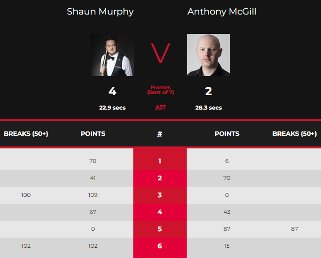 第四局,墨菲凭借67:43的表现拿下此局比赛的胜利并以3-1领先麦克吉尔成功拿到赛点。第五局,麦克吉尔单杆轰出87分拿下此局比赛的胜利并以2-3落后墨菲将比分缩小到了一局。第六局,墨菲单杆轰102分102:15拿下此局比赛胜利4-2击败麦克吉尔。