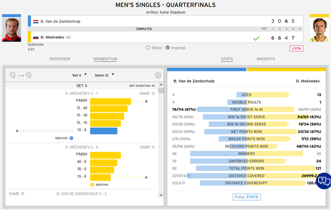 第四盘,前11局双方各自保发,其中,梅德韦杰夫在第10局错失了1个盘点。不过,第12局,俄罗斯人利用对手的4个失误,拿下破发胜赛局,以7-5再胜一盘,大比分3-1晋级4强。整盘用时43分钟。