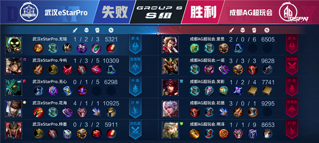 开局双方中路抢线,周瑜拿下一血。2分17秒蒙恬推掉上路一塔。2分24秒周瑜推掉下路一塔。2分50秒武汉eStarPro拿下主宰。4分13秒暴君团,武汉eStarPro打出1换2,阿古朵拿下暴君。5分48秒蒙恬推掉下路一塔。5分52秒周瑜推掉中路一塔。7分04秒阿古朵拿下主宰。7分38秒周瑜推掉上路二塔。8分40秒赵云拿下暴君。11分35秒中路团战,双方打出2换2,关羽拿下双杀,成都AG超玩会推掉中路二塔。12分30秒太乙真人被击杀。12分55秒野区团战,成都AG超玩会打出2换4,张飞拿下双杀。成都AG超玩会顺势一波推掉中路高地塔。13分47秒成都AG超玩会攻破水晶拿下本场比赛胜利。