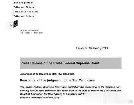 去年12月24日,瑞士联邦最高法院曾发布新闻公报,宣布撤销国际体育仲裁法庭对孙杨的禁赛处罚,但并未公布原因。本次公报则是瑞士联邦最高法院首次公布撤销上述判决的原因。