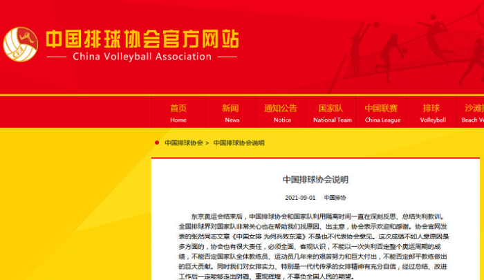 来源:24直播网09-01 09:5924直播网9月01日讯 近日关于中国女排的消息引发全民关注,起因是在中国排协发布到官网的一篇长文《中国女排为何兵败东瀛》,总结中国女排在奥运会失败的原因,从阵容、指挥、集训等5个原因批评这支女排队伍,几乎可以说是全盘否定了女排的努力和郎平的作用。之后排协发文称这文章不代表官方的意见,是91岁的中国排球名宿张然撰写,只是刊登在了中国排协的官网上而已,但这依旧不能令球迷们的怒火熄灭。