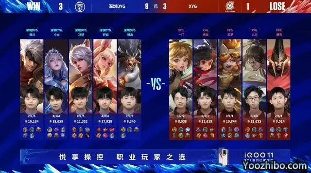 决胜局,深圳DYG蓝色方,拿到了露娜+公孙离。XYG红色方,拿到了宫本武藏+李元芳。开局上路XYG击杀夏侯惇,拿下一血。10分钟,深圳DYG控制链拉满,秒掉孙膑,一波零换三,直推中路一塔。13分钟,深圳DYG经济差拉开五千。决胜团,深圳DYG一波零换三,直推水晶,拿下最终胜利!