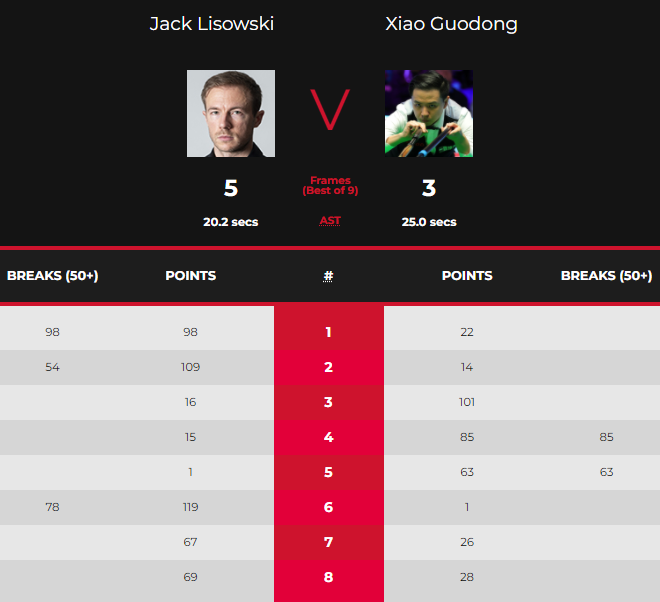 紧接着,利索夫斯基凭借单杆79分119:1、67:26、69:28连胜三局以5-3击败中国球员肖国栋成功晋级四强行列。