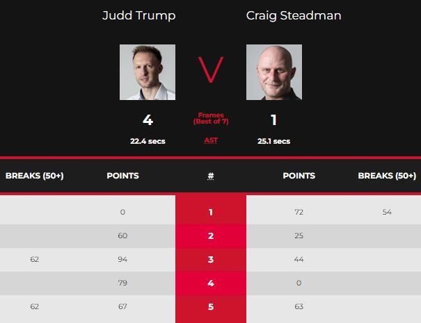 第四局,特鲁姆普又是多次上手79-0零封拿下,大比分3-1拿到了赛点。第五局,斯特德曼率先上手打到了41分,不过特鲁姆普打进一颗红球后打丢粉球失误,斯特德曼再次上手,63分中断,特鲁姆普随后清台单局逆转,大比分4-1晋级。