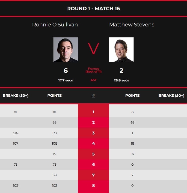 在首局比赛中,奥沙利文率先在防守中出现失误,随后史蒂文斯打进左侧底袋红球失误被迫选择防守。在防守大战之中,奥沙利文成功拼进远台红球获得上手机会。单杆轰出81分击打红球出现失误母球摔袋被罚4分。最终,奥沙利文以81:8拿下此局比赛的胜利从而以1-0领先史蒂文斯迎来开门红。第二局,奥沙利文拼进超难远台红球上手拿到7分选择防守,史蒂文斯打进红球拿到8分失误。随后奥沙利文出现失误,史蒂文斯两次上手拿到29分失误,奥沙利文打进红球再次上手。拿到28分出现失误。史蒂文斯打进红球再次获得上手的机会并以65:35拿下此局1-1战平奥沙利文。