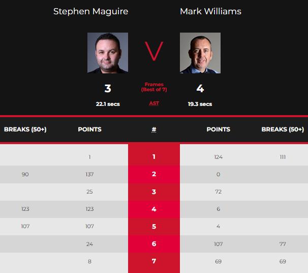 第五局,马奎尔单杆轰出107分的表现以107:4拿下此局比赛的胜利以3-2领先威廉姆斯率先拿到赛点。第六局,威廉姆斯单杆轰出77分以107:24拿下此局比赛的胜利3-3战平马奎尔。第七局,威廉姆斯单杆轰出69分以69:8拿下此局比赛的胜利以4-3逆转绝杀马奎尔成功晋级八强席位,威廉姆斯依然非常强大。